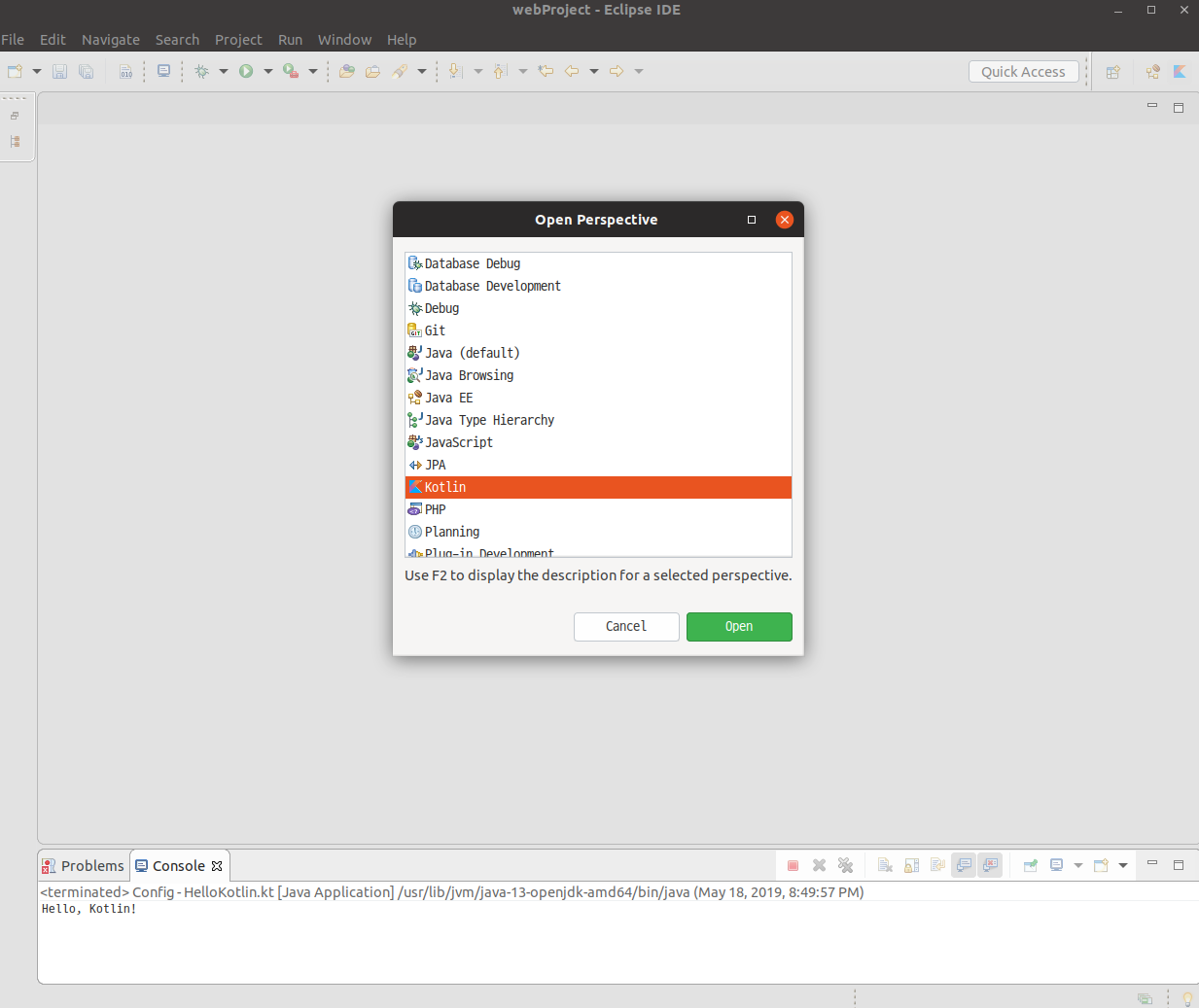 4.우측 추가버튼을 눌러 Open Perspective 팝업창에서 코틀린 선택